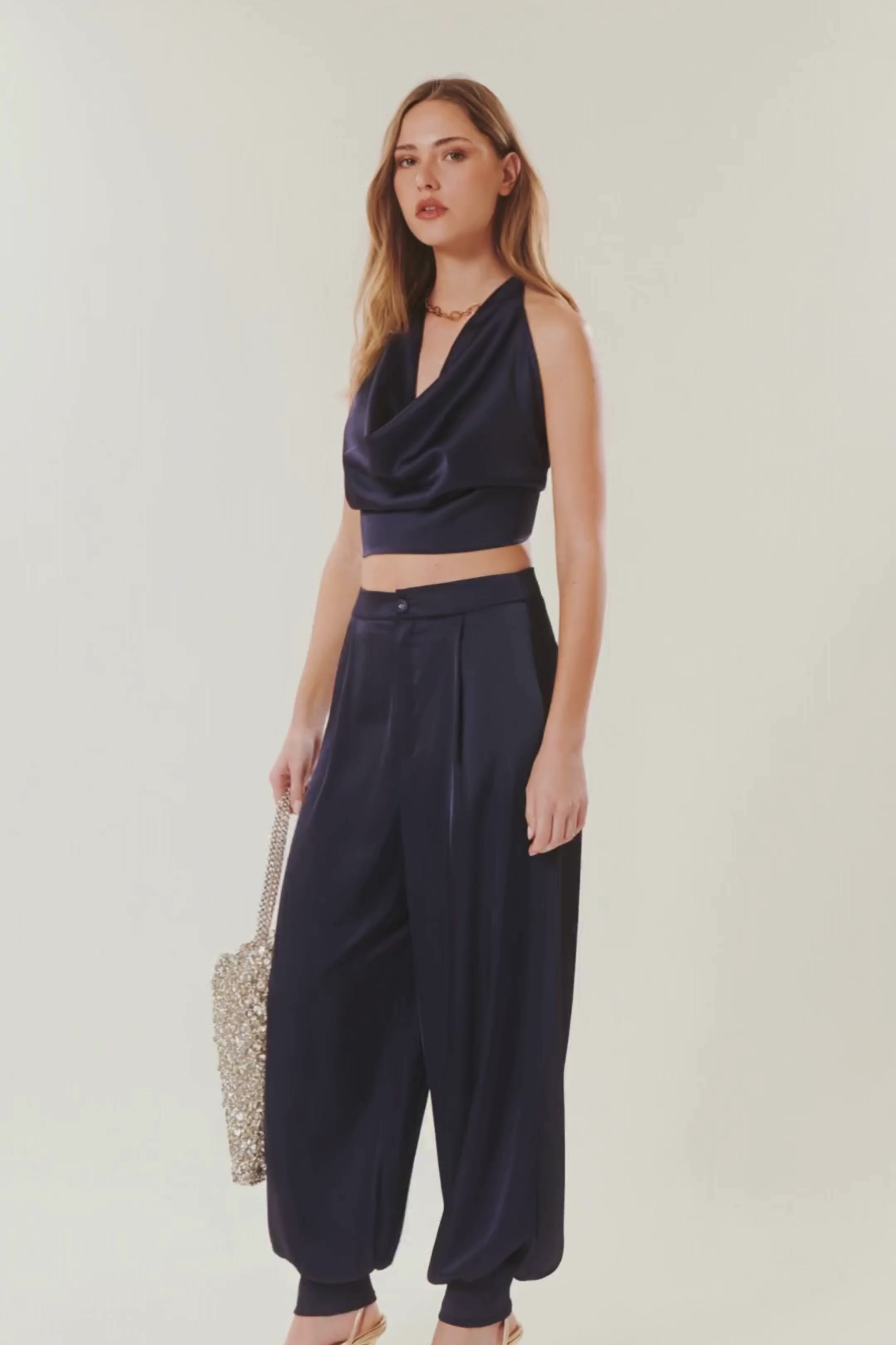 Audace e sofisticato, questo pantalone satinato dal taglio balloon reinterpreta l'eleganza con una silhouette moderna e strutturata. Il suo tessuto satinato luminoso e il volume arrotondato alle caviglie conferiscono carattere e fluidità, per un look chic e deciso dal giorno alla sera.